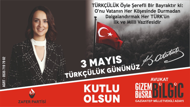 Kafkaslardan esen yeller, Türklüğe selam söyler; dünya Türklüğünün Türkçülük bayramı kutlu olsun. Ne mutlu TÜRKÜM diyene diyen Zafer Partisi Gaziantep Milletvekili Adayı Avukat Gizem Büşra Bilgiç,3 Mayıs Dünya Türkçülük günü ile ilgili yaptığı açıklamada 3 Mayıs Türkçülük Gününün İlk kez 1945 yılında Tophane'deki Askeri Cezaevinde mahkumlar tarafından kutlandığını söyledi.