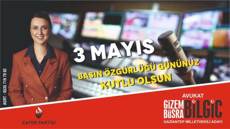 Zafer Partisi Gaziantep Milletvekili adayı Avukat Gizem Büşra Bilgiç, Özgür Basının Türk Milletinin ve Zafer Partisinin Vazgeçilmez değeri olduğunu ifade ederek, 3 Mayıs dünya basın özgürlüğü gününü kutladı.