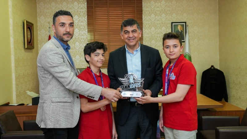 TEKNOFEST’e Bilim Şehitkamil çatısı altında hazırlanan ve ‘Ulaşım Teknolojileri’ kategorisinde yarışarak Türkiye 2.’si olan Ahmet Barut ve Musab Demiray, verdiği destek dolayısıyla Ş. Belediye Başkanı Rıdvan Fadıloğlu’na teşekkür ziyaretinde bulundu