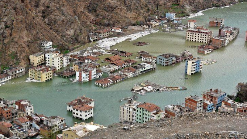 Yol ve köprülerin dipte kaldığı ilçede, baraj suları eski yerleşim yerinden geçen viyadük ayaklarına dayandı, terk edilen binaların büyük kısmı su altında kaldı.